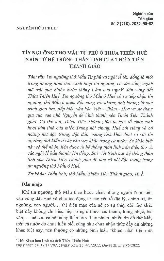 Tín ngưỡng thờ Mẫu Tứ phủ ở Thừa Thiên Huế nhìn từ hệ thống thần linh của Thiên Tiên Thánh giáo = Worship of Mother Goddesses - Four Palaces in Thừa Thiên Huế: viewpoint from divine system of Thiên Tiên religion
