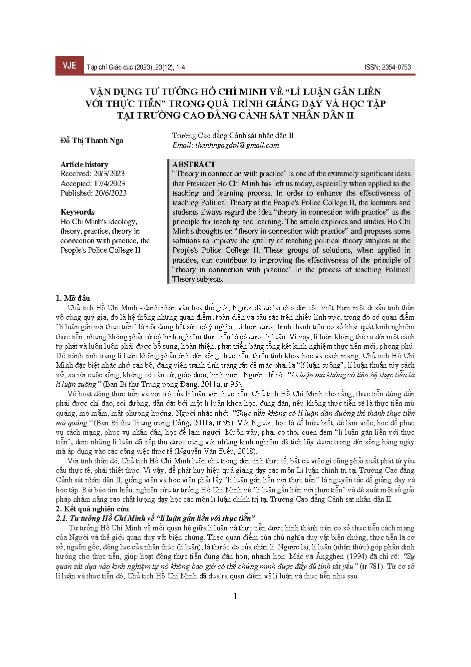Vận dụng tư tưởng Hồ Chí Minh về "Lí luận gắn liền với thực tiễn" trong quá trình giảng dạy và học tập tại Trường Cao đẳng Cảnh sát Nhân dân II = Applying Ho Chi Minh's thought on "Theory associated with practice" in the teaching and learning process at P