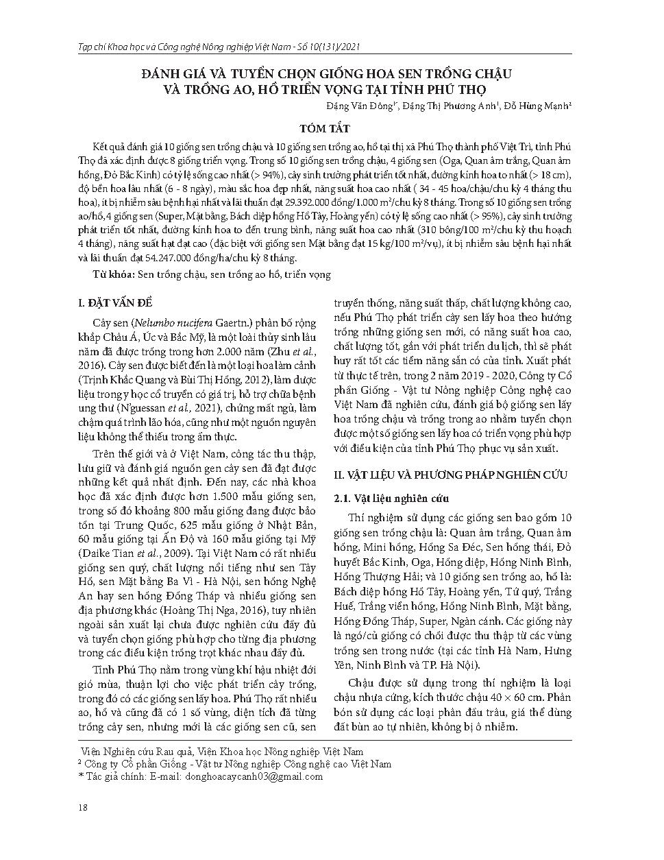 Đánh giá và tuyển chọn giống hoa sen trồng chậu và trồng ao, hồ triển vọng tại tỉnh Phú Thọ = Evaluation and selection of promising lotus varieties planted in pot and in lake, pond in Phu Tho province