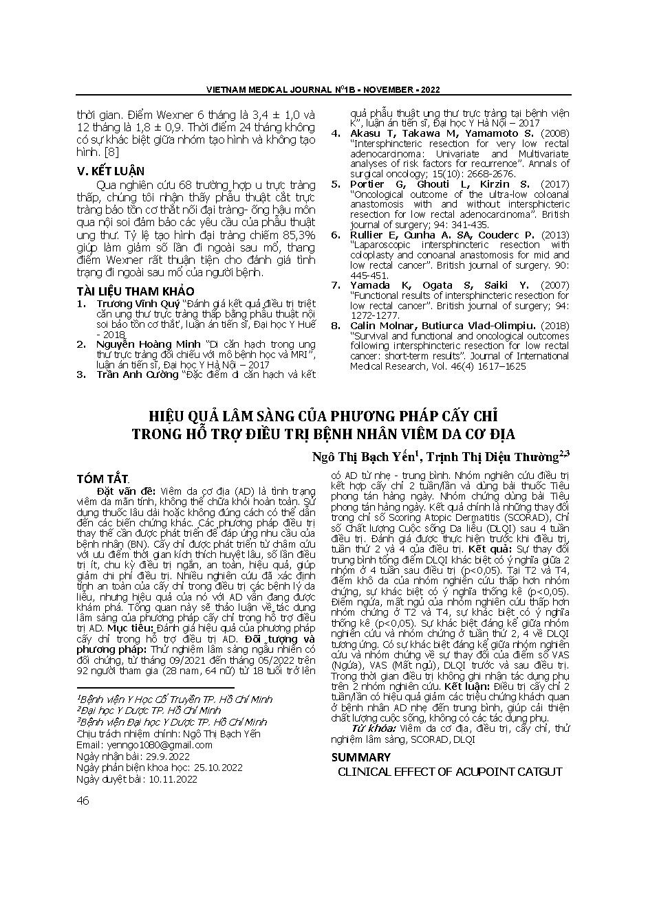 Hiệu quả lâm sàng của phương pháp cấy chỉ trong hỗ trợ điều trị bệnh nhân viêm da cơ địa = Clinical effect of acupoint catgut embedding for the treatment of atopic dermatitis patients