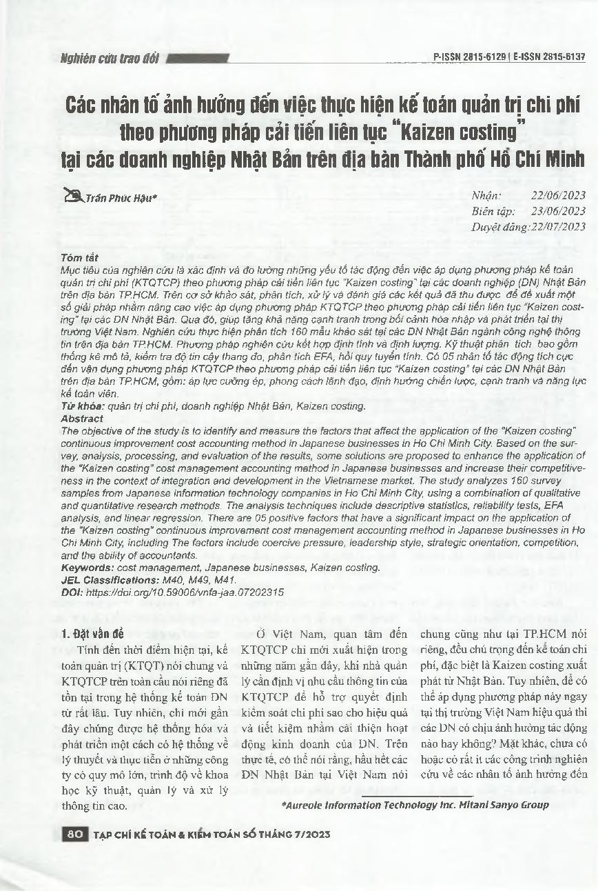 Các nhân tố ảnh hưởng đến việc thực hiện kế toán quản trị chi phí theo phương pháp cải tiến liên tục "Kaizen costing" tại các doanh nghiệp Nhật Bản trên địa bàn TP. Hồ Chí Minh