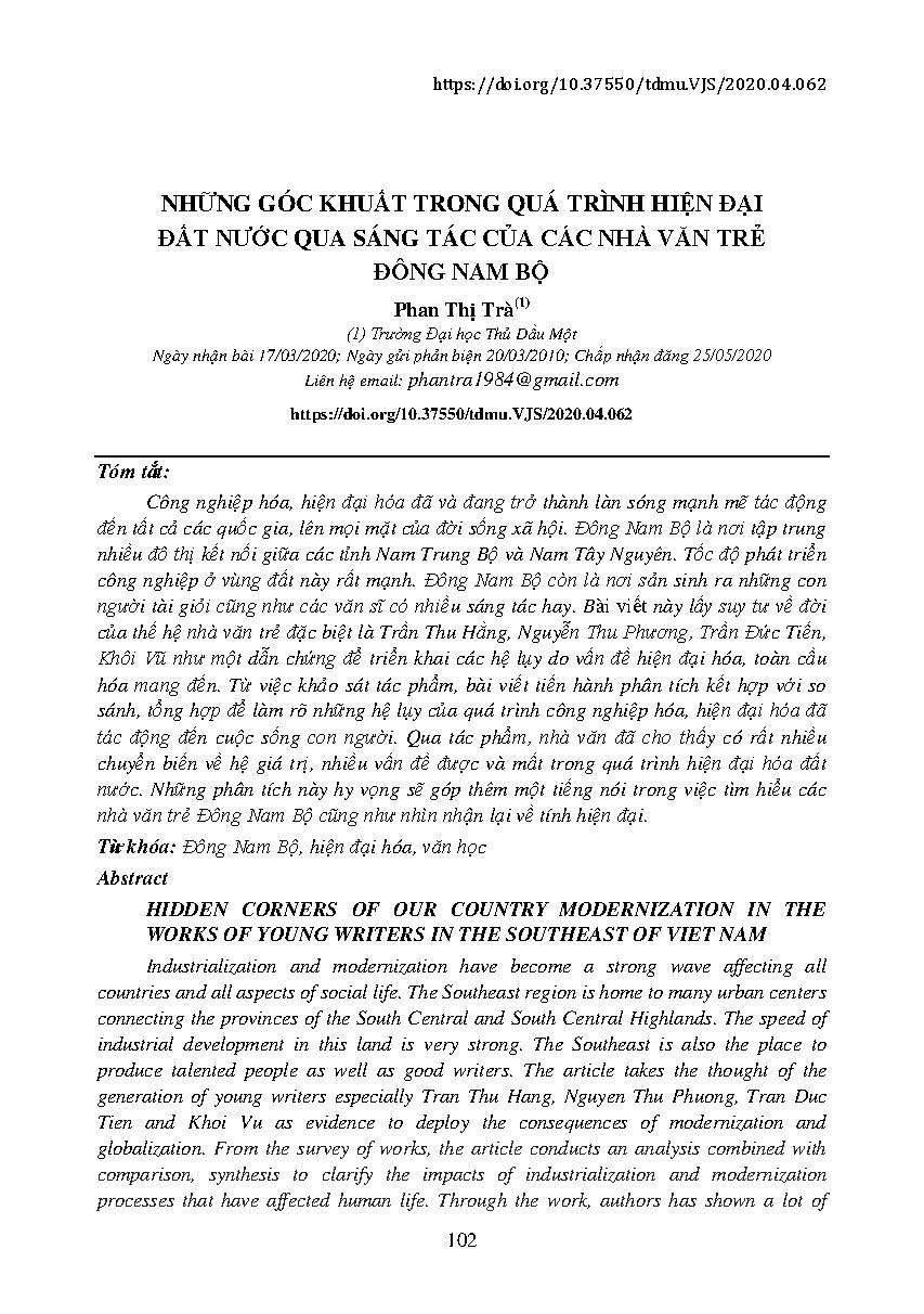 Những góc khuất trong quá trình hiện đại đất nước qua sáng tác của các nhà văn trẻ Đông Nam Bộ = Hidden corners of our country modernization in the works of young writers in the Southeast of Viet Nam