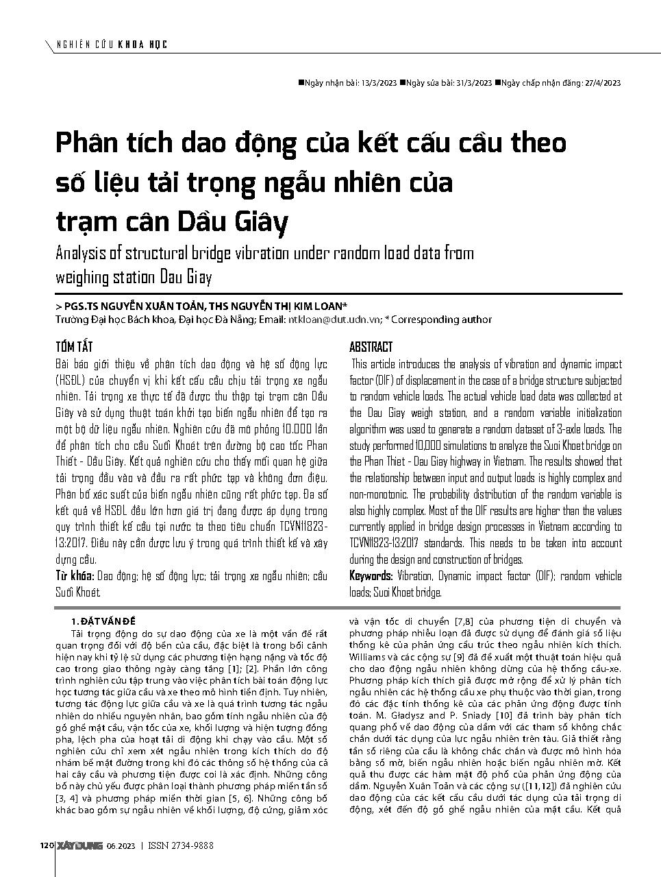 Phân tích dao động của kết cấu cầu theo số liệu tải trọng ngẫu nhiên của trạm cân Dầu Giây = Analysis of structural bridge vibration under random load data from weighing station Dau Giay