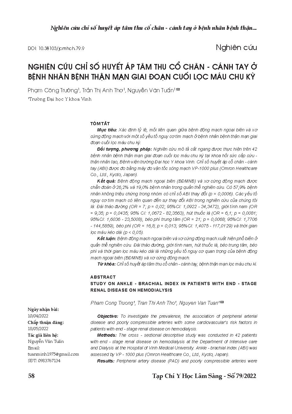 Nghiên cứu chỉ số huyết áp tâm thu cổ chân - cánh tay ở bệnh nhân bệnh thận mạn giai đoạn cuối lọc máu chu kỳ = Study on ankle - brachial index in patients with end - stage renal disease on hemodialysis