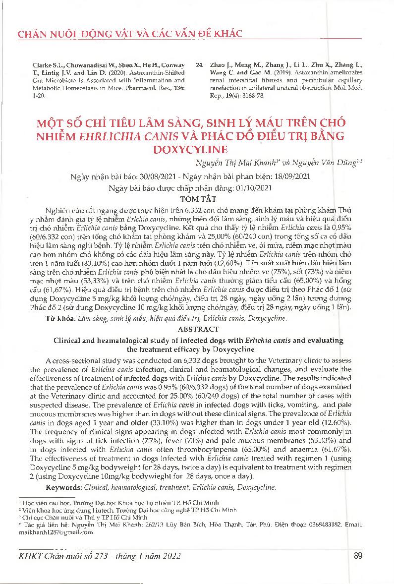 Một số chỉ tiêu lâm sàng, sinh lý máu trên chó nhiễm Ehrlichia Canis và phác đồ điều trị bằng Doxycyline = Clinical and heamatological study of infected dogs with Erlichia canis and evaluating the treatment efficacy by Doxycycline