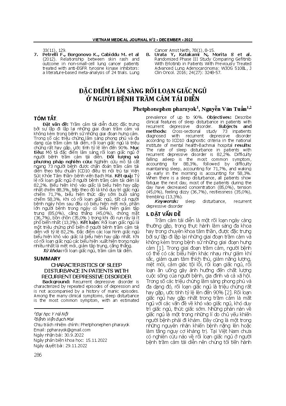 Đặc điểm lâm sàng rối loạn giấc ngủ ở người bệnh trầm cảm tái diễn = Characteristics of sleep disturbance in patients with recurrent depressive disorder