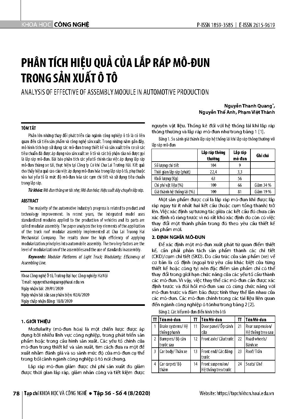 ANALYSIS OF EFFECTIVE OF ASSEMBLY MODULE IN AUTOMOTIVE PRODUCTION = PHÂN TÍCH HIỆU QUẢ CỦA LẮP RÁP MÔ-ĐUN TRONG SẢN XUẤT Ô TÔ
