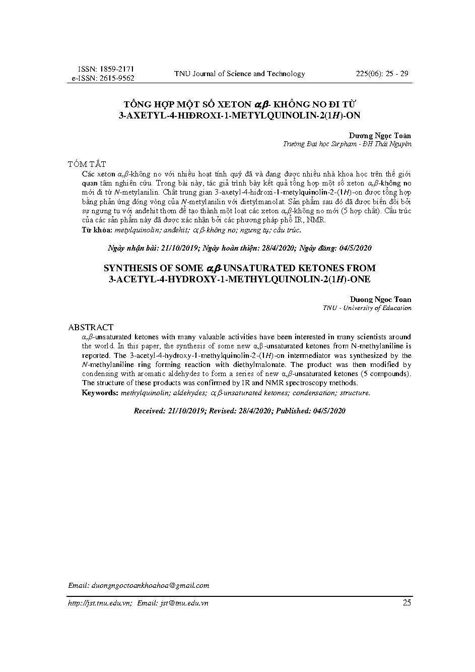 TỔNG HỢP MỘT SỐ XETON ,- KHÔNG NO ĐI TỪ 3-AXETYL-4-HIĐROXI-1-METYLQUINOLIN-2(1H)-ON = SYNTHESIS OF SOME ,-UNSATURATED KETONES FROM 3-ACETYL-4-HYDROXY-1-METHYLQUINOLIN-2(1H)-ONE