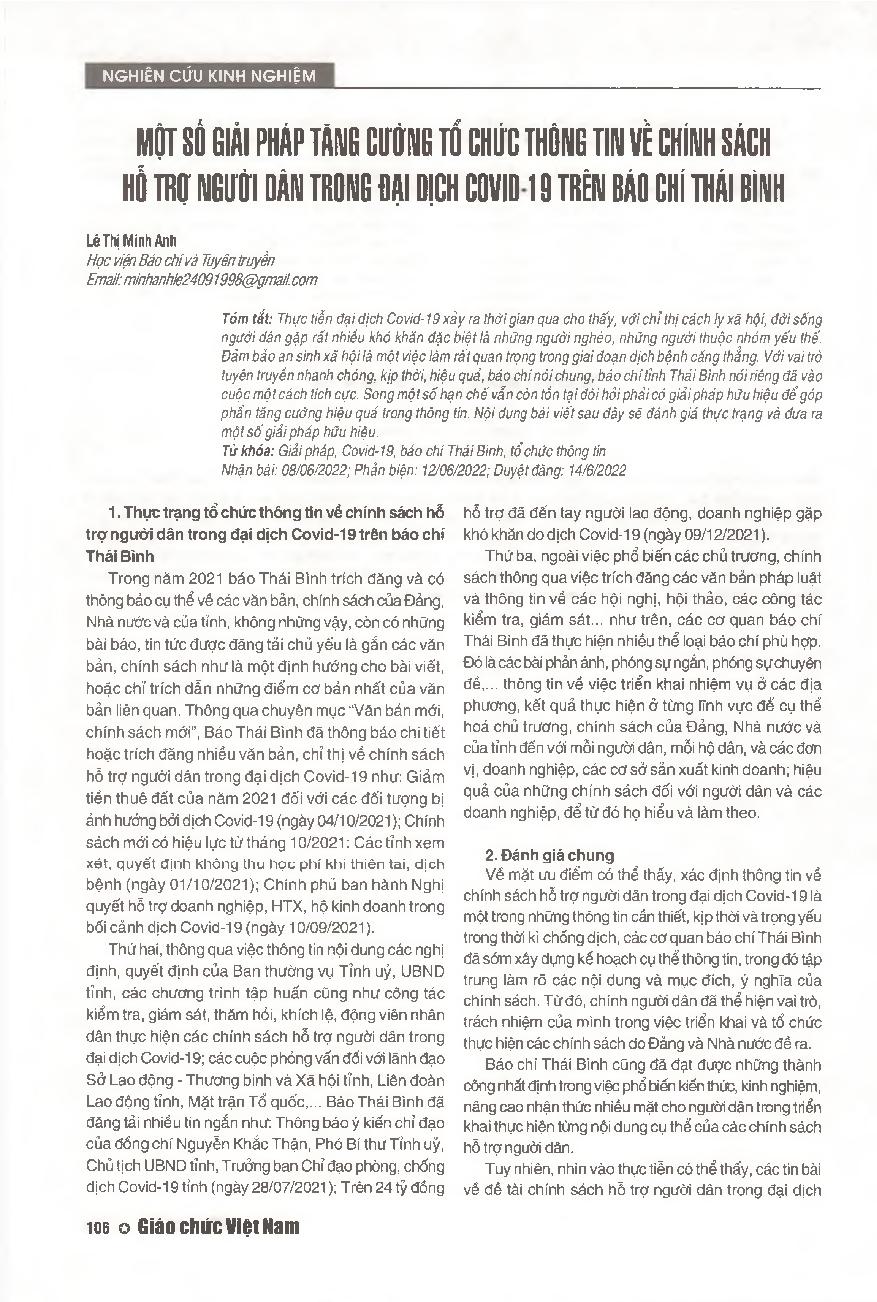 Một số giải pháp tăng cường tổ chức thông tin về chính sách hỗ trợ người dân trong đại dịch Covid-19 trên báo chí Thai Bình