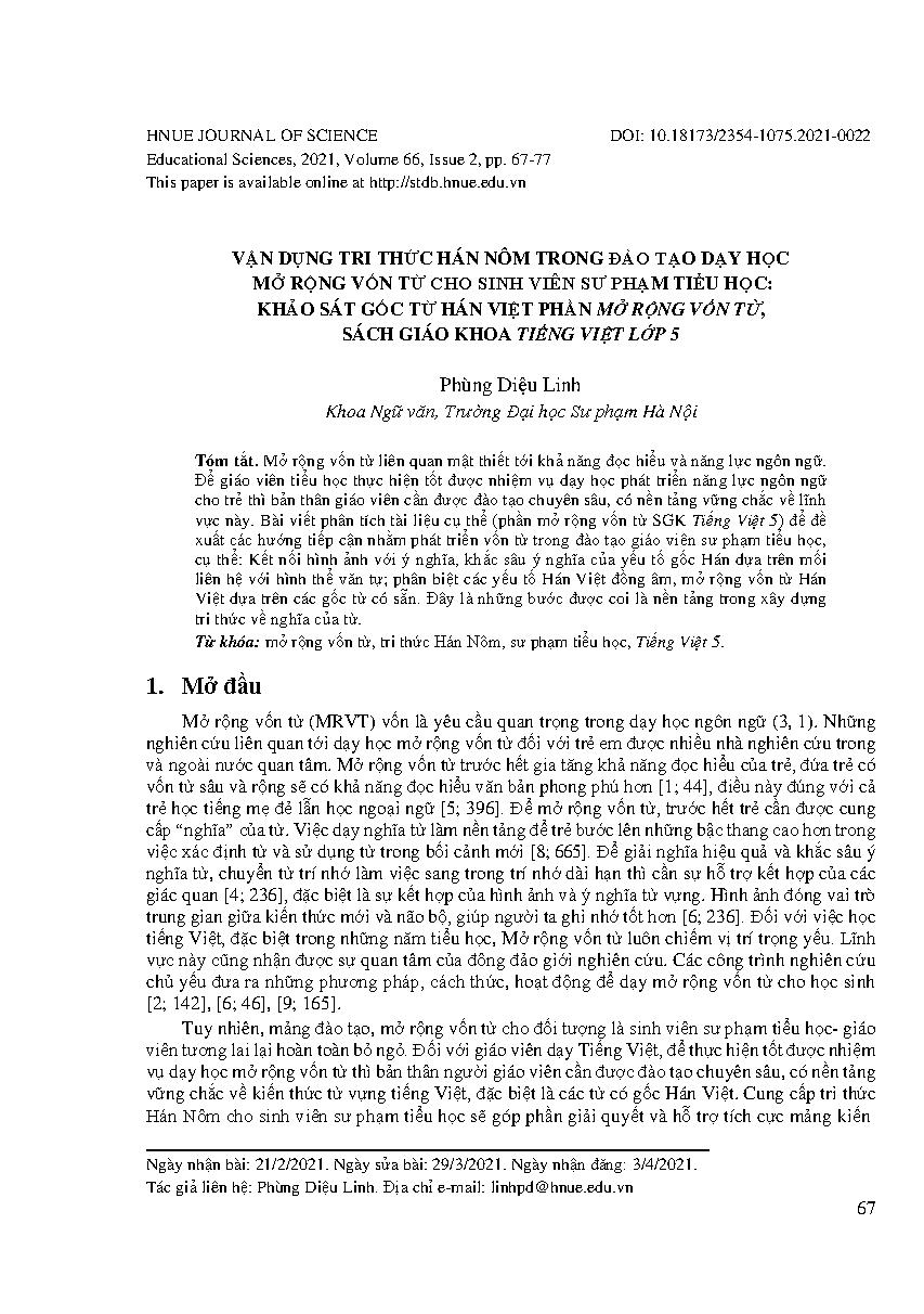 Vận dụng tri thức hán nôm trong đào tạo dạy học mở rộng vốn từ cho sinh viên sư phạm tiểu học: khảo sát gốc từ Hán Việt phần mở rộng vốn từ, sách giáo khoa tiếng việt lớp 5 = Applying the Sino – Nom knowledge in training vocabulary development at primary students – teachers: analysis Grade 5 Vietnamese language