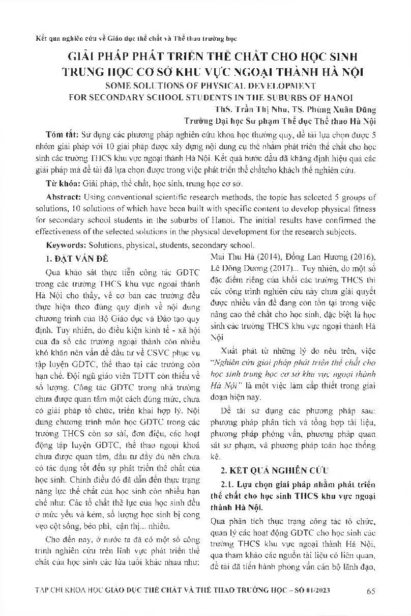 Giải pháp phát triển thể chất cho học sinh Trung học cơ sở khu vực ngoại thành Hà Nội = Some solutions of physical development for secondary school students in the suburbs of Hanoi