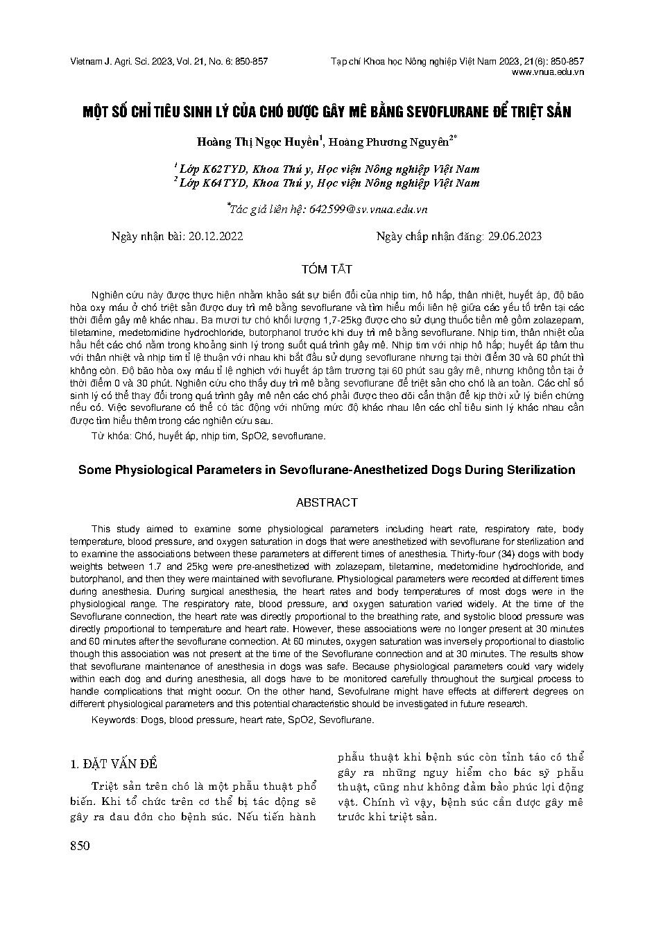 Một số chỉ tiêu sinh lý của chó được gây mê bằng sevoflurane để triệt sản = Some Physiological Parameters in Sevoflurane-Anesthetized Dogs During Sterilization