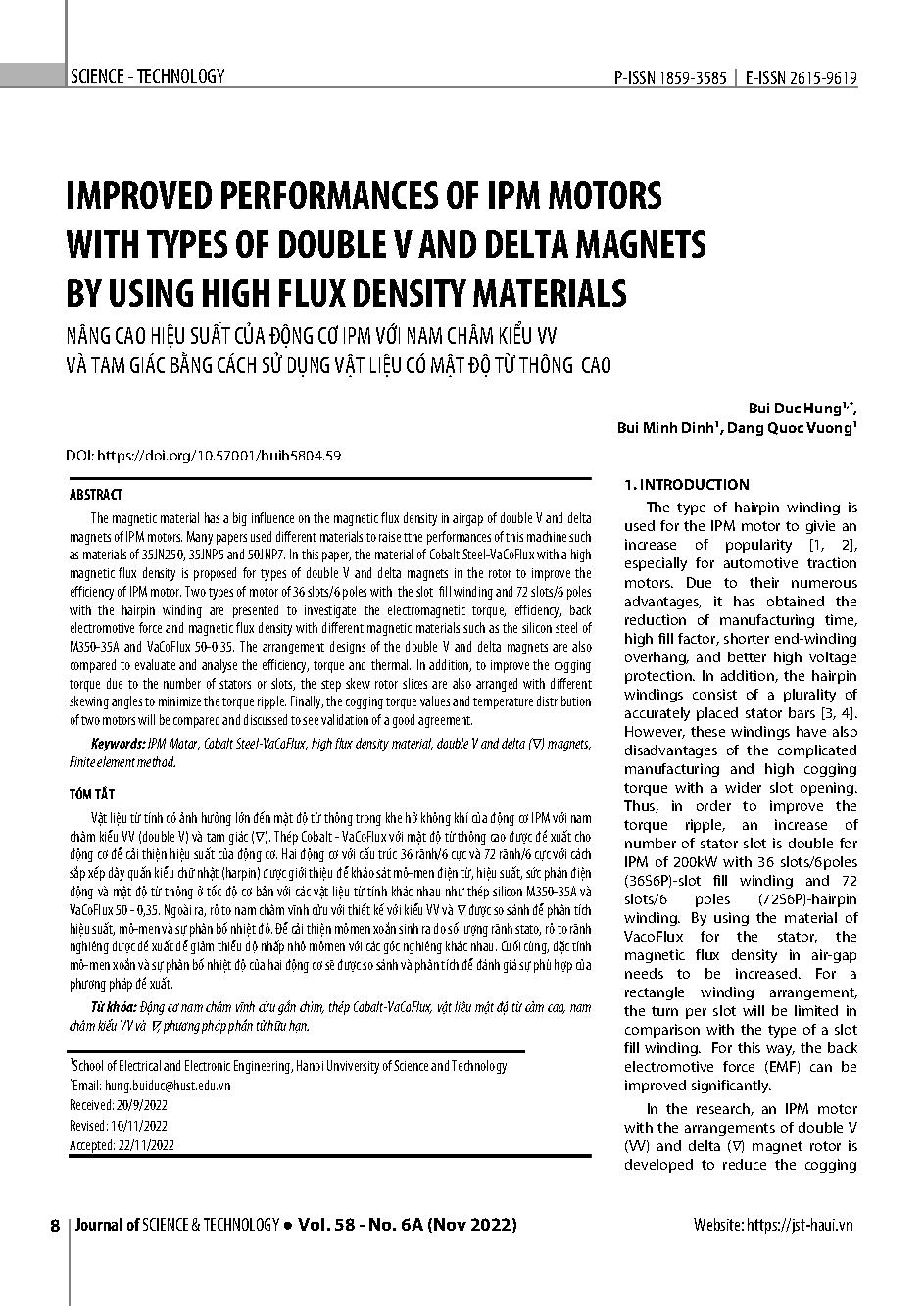 Nâng cao hiệu suất của động cơ IPM với nam châm kiểu VV và tam giác bằng cách sử dụng vật liệu có mật độ từ thông cao của thép cobalt = Improved performances of double V and delta IPM motors by using the high flux density material of cobalt steels
