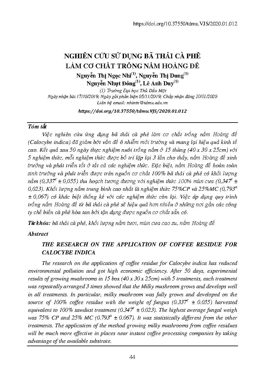Nghiên cứu sử dụng bã thải cà phê làm cơ chất trồng nấm hoàng đế = The research on the application of coffee residue for calocybe indica