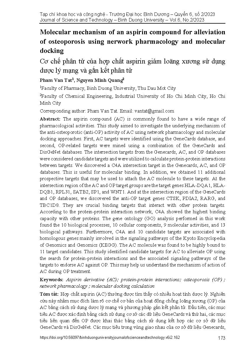 Cơ chế phân tử của hợp chất aspirin giảm loãng xương sử dụng dược lý mạng và gắn kết phân tử = Molecular mechanism of an aspirin compound for alleviation of osteoporosis using nerwork pharmacology and molecular docking