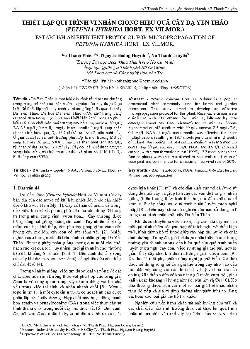 Thiết lập qui trình vi nhân giống hiệu quả cây dạ yến thảo (petunia hybrida hort. ex vilmor.) = Establish an efficient protocol for micropropagation of petunia hybrida hort. ex vilmor.