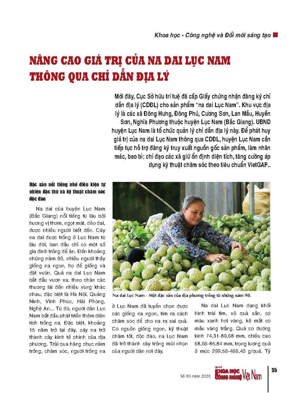 Improving the value of Luc Nam Annona squamosal through geographical indications. = Nâng cao giá trị của na dai Lục Nam thông qua chỉ dẫn địa lý.