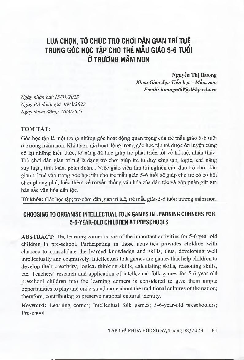 Lựa chọn, tổ chức trò chơi dân gian trí tuệ trong góc học tập cho trẻ mẫu giáo 5-6 tuổi ở trường mầm non = Choosing To Organize Intellectual Folk Games In Learning Corners For 5 6-Year Old Children At Preschools
