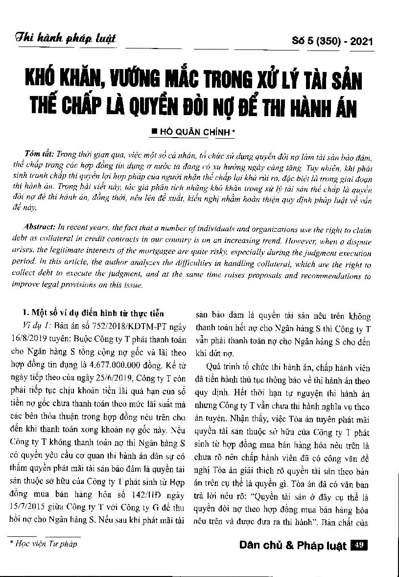 Khó khăn, vướng mắc trong xử lý tài sản thế chấp là quyền đòi nợ để thi hành án