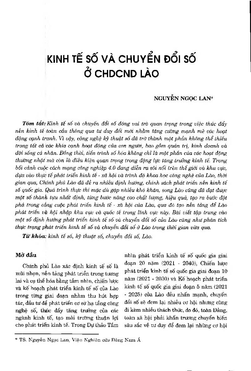 Kinh tế số và chuyển đổi số ở CHDCND Lào = Digital Economy and Digital Transformation in Laos