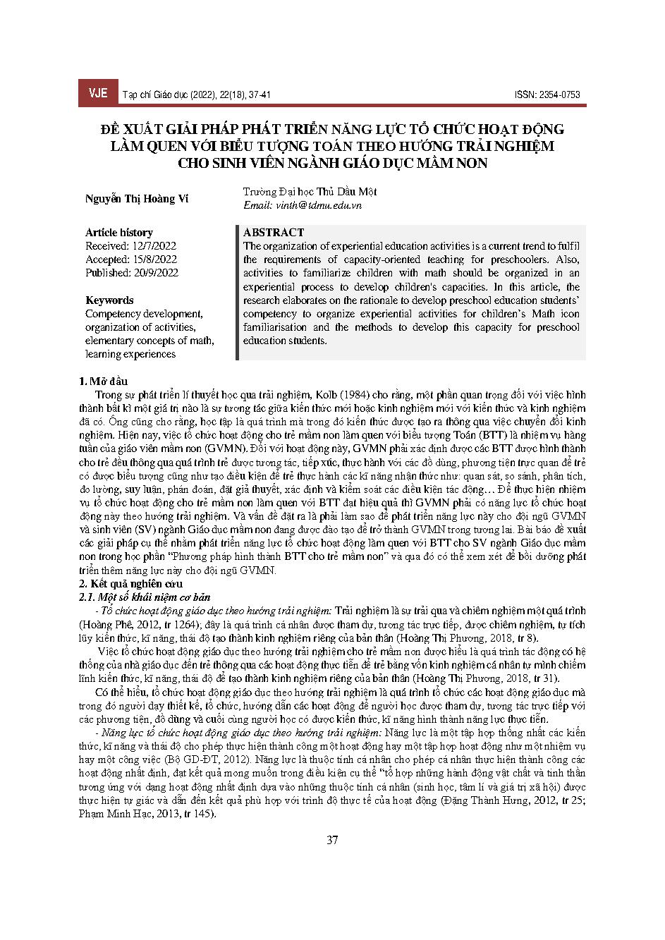 Đề xuất giải pháp phát triển năng lực tổ chức hoạt động làm quen với biểu tượng toán theo hướng trải nghiệm cho sinh viên ngành giáo dục mầm non = Proposing solutions to develop the capacity of organizing activities to familiarize yourself with mathematic