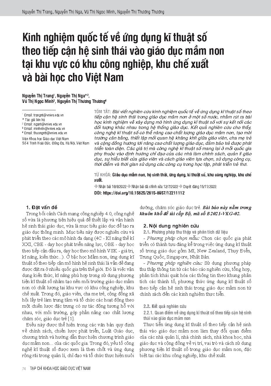 Kinh nghiệm quốc tế về ứng dụng kĩ thuật số theo tiếp cận hệ sinh thái vào giáo dục mầm non tại khu vực có khu công nghiệp, khu chế xuất và bài học cho Việt Nam = International experience in digital application according to the ecosystem approach to early
