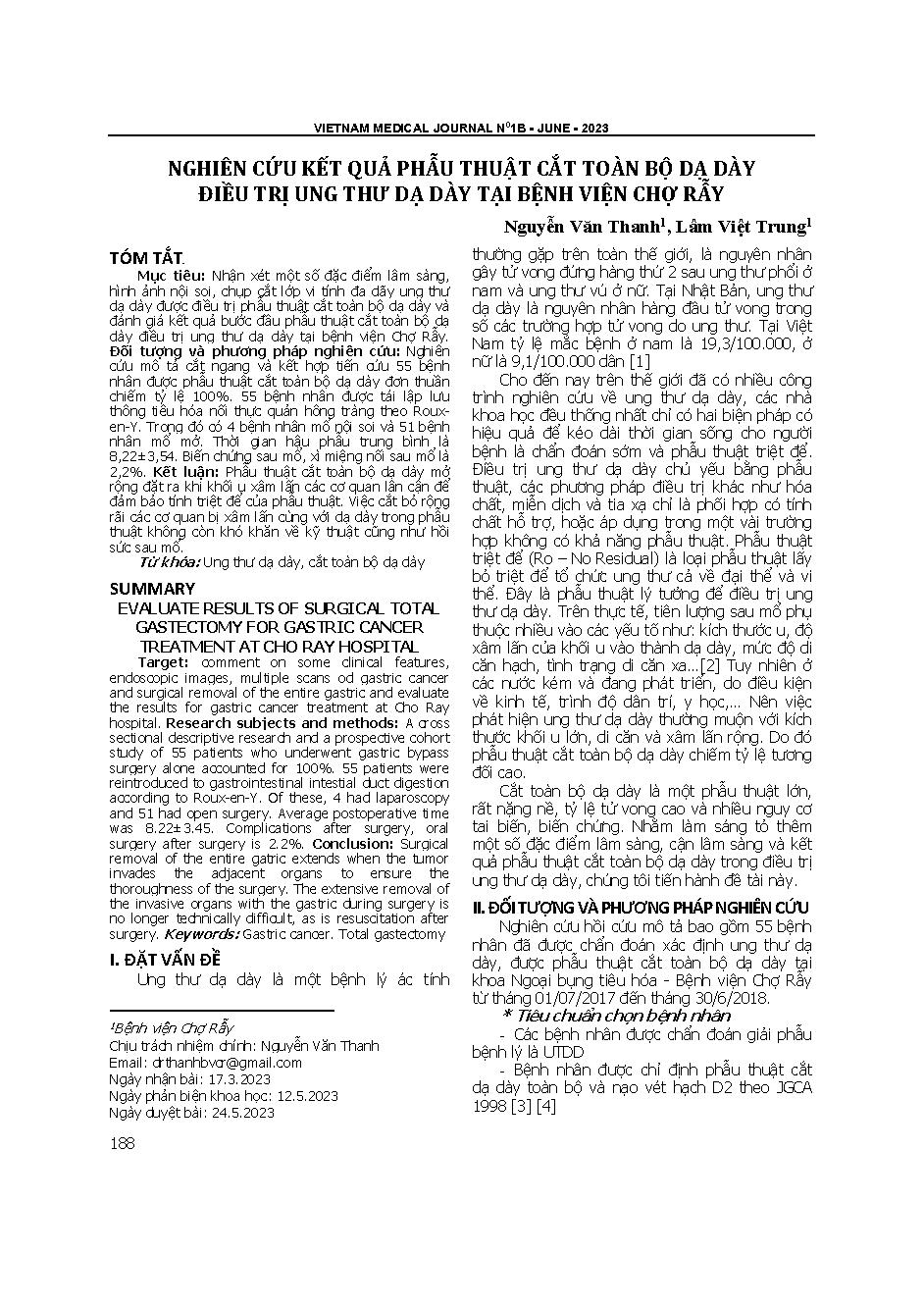 Nghiên cứu kết quả phẫu thuật cắt toàn bộ dạ dày điều trị ung thư dạ dày tại Bệnh viện Chợ Rẫy = Evaluate results of surgical total gastrectomy for gastric cancer treatment at Cho Ray hospital