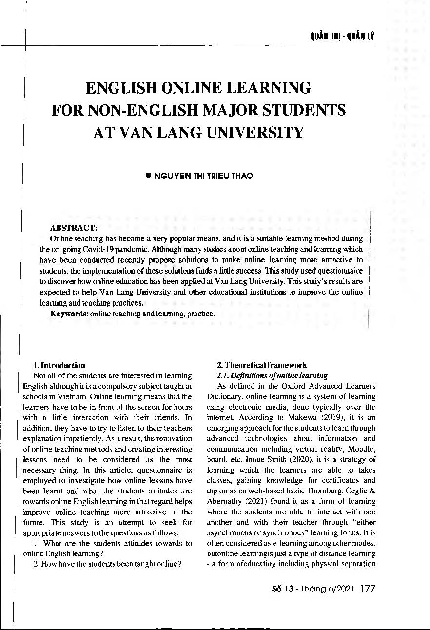 Dạy học tiếng Anh trực tuyến cho sinh viên không phải chuyên ngành tiếng Anh tại Trường Đại học Văn Lang = English online learning for non-English major students at Van Lang University