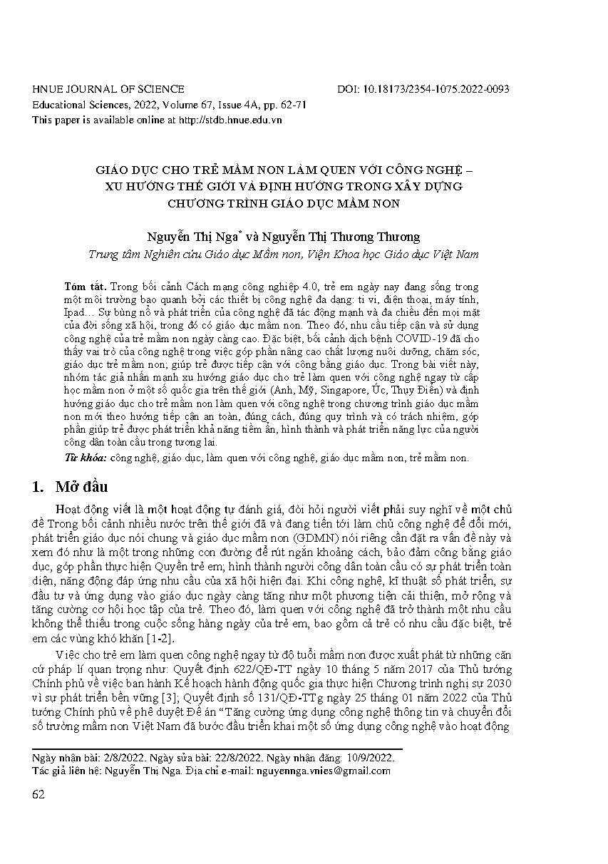 Giáo dục cho trẻ mầm non làm quen với công nghệ –xu hướng thế giới và định hướng trong xây dựng chương trình giáo dục mầm non = Education for children get acquainted with technology– World trends and constructing a preschool curriculum