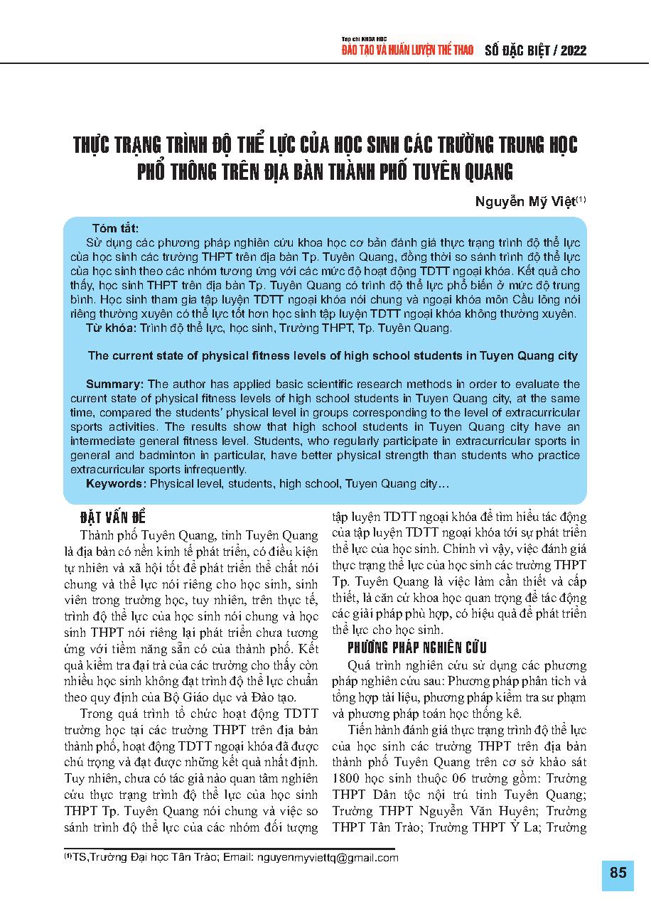 Thực trạng trình độ thể lực của học sinh các trường Trung học phổ thông trên địa bàn TP Tuyên Quang = The current state of physical fitness levels of high school students in Tuyen Quang city