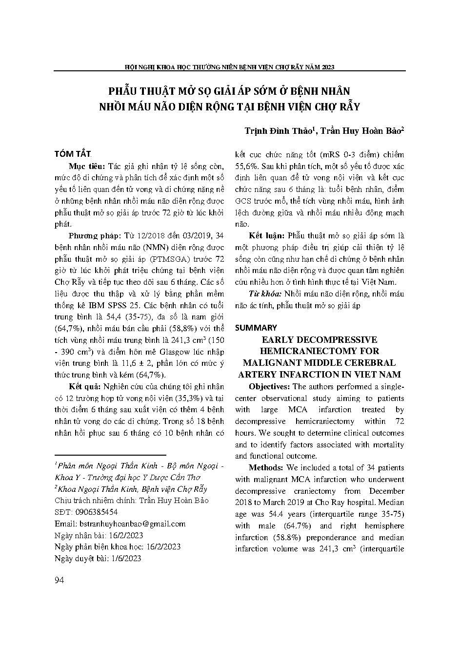 Phẫu thuật mở sọ giải áp sớm ở bệnh nhân nhồi máu não diện rộng tại Bệnh viện Chợ Rẫy