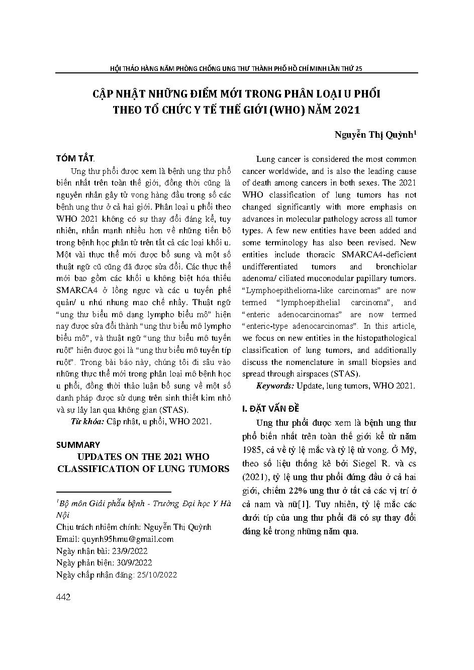 Cập nhật những điểm mới trong phân loại u phổi theo Tổ chức Y tế thế giới (WHO) năm 2021 = Updates on the 2021 who classification of lung tumors