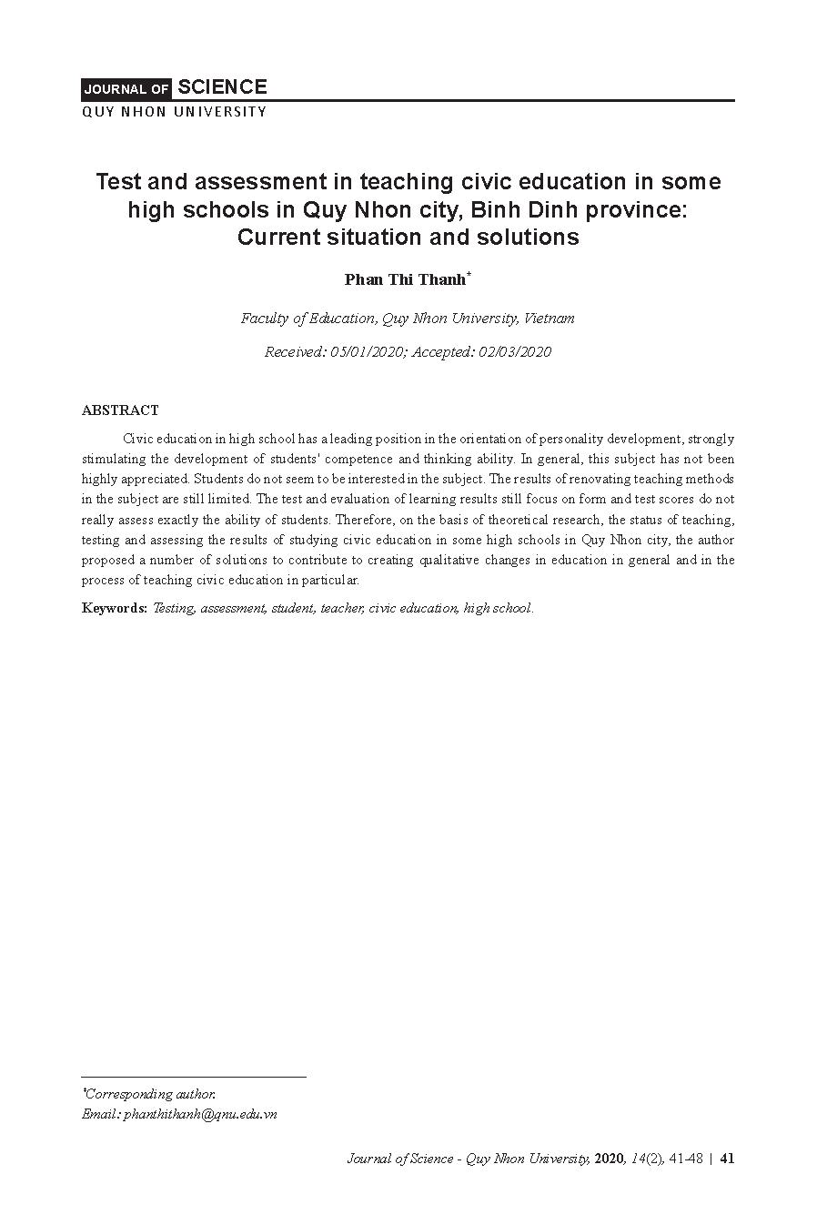 Kiểm tra, đánh giá trong dạy học môn Giáo dục công dân ở một số trường THPT trên địa bàn thành phố Quy Nhơn, tỉnh Bình Định: Thực trạng và giải pháp = Test and assessment in teaching civic education in some high schools in Quy Nhon city, Binh Dinh province: Current situation and solutions