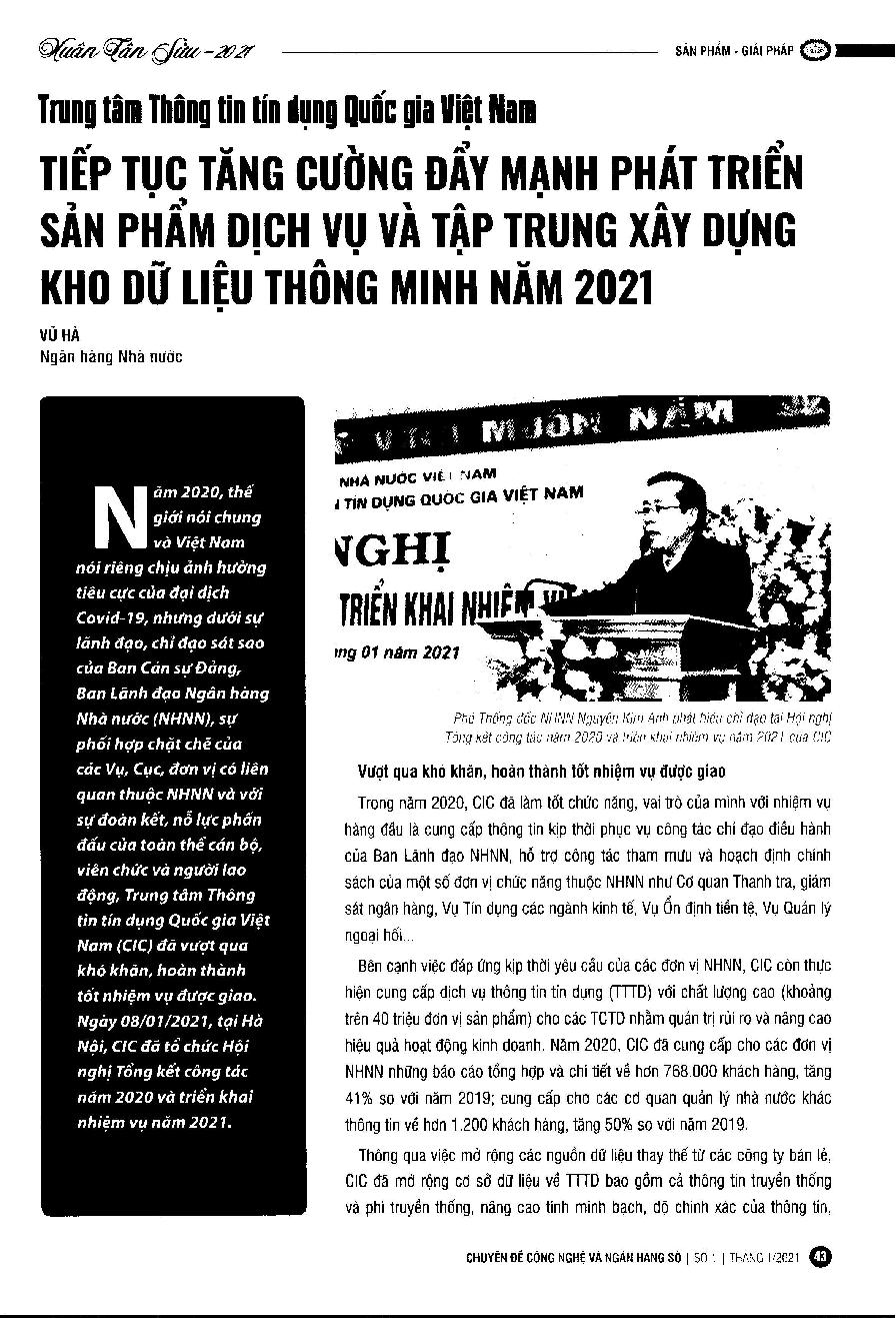 Trung tâm Thông tin Tín dụng Quốc gia Việt Nam tiếp tục tăng cường đẩy mạnh phát triển sản phẩm dịch vụ và tập trung xây dựng kho dữ liệu thông minh năm 2021