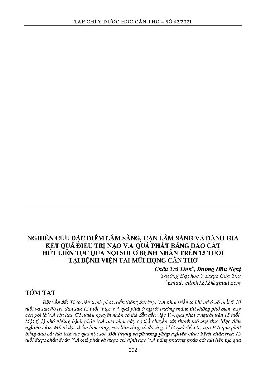 Nghiên cứu đặc điểm lâm sàng, cận lâm sàng và đánh giá kết quả điều trị nạo v.a quá phát bằng dao cắt hút liên tục qua nội soi ở bệnh nhân trên 15 tuổi tại bệnh viện tai mũi họng cần thơ = Studying the clinical, subclinical characteristics and assessing the results of adenoidectomy by microdebrider in the patients from 15 years old at can tho ear nose throat hospital