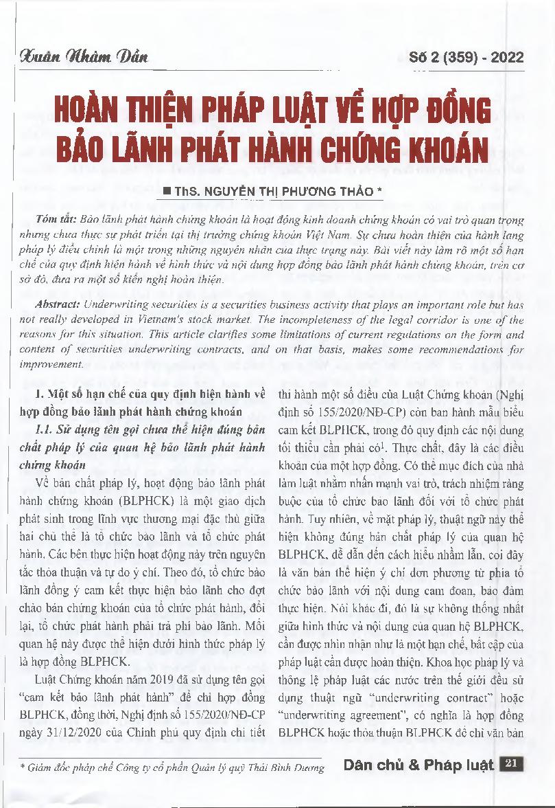 Hoàn thiện pháp luật về hợp đồng bảo lãnh phát hành chứng khoán = Completing the law on securities underwriting contracts