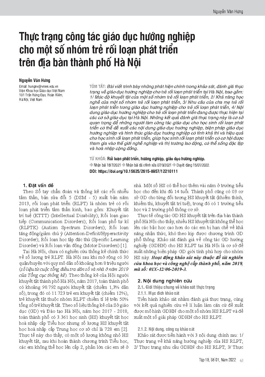 Thực trạng công tác giáo dục hướng nghiệp cho một số nhóm trẻ rối loạn phát triển trên địa bàn thành phố Hà Nội = Current situation of vocational education for students with developmental disorders at specialized schools in Hanoi city
