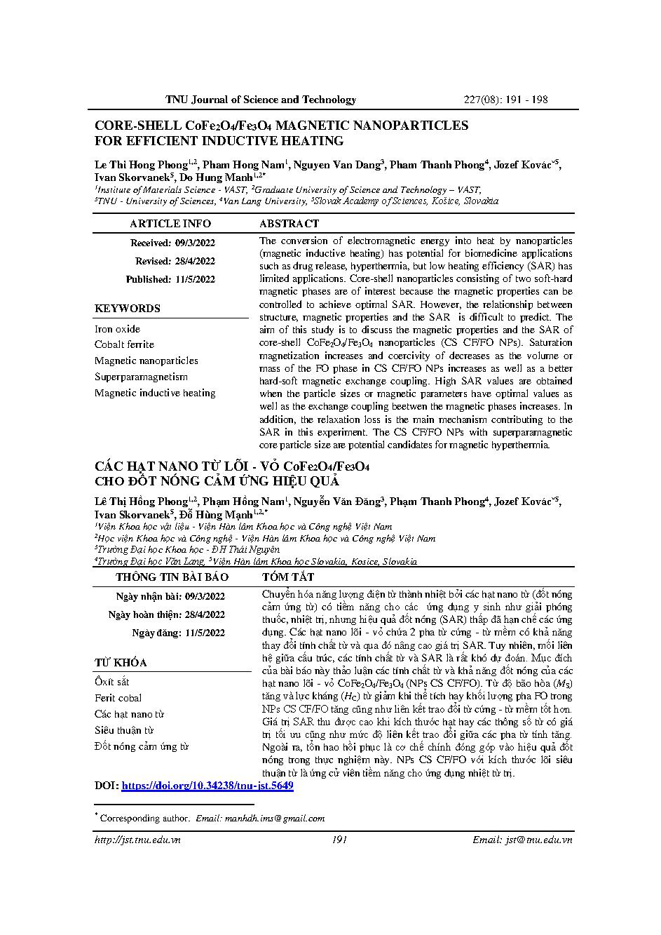 Các hạt nano từ lõi - vỏ cofe2o4/fe3o4 cho đốt nóng cảm ứng hiệu quả = Core-shell cofe2o4/fe3o4 magnetic nanoparticles for efficient inductive heating