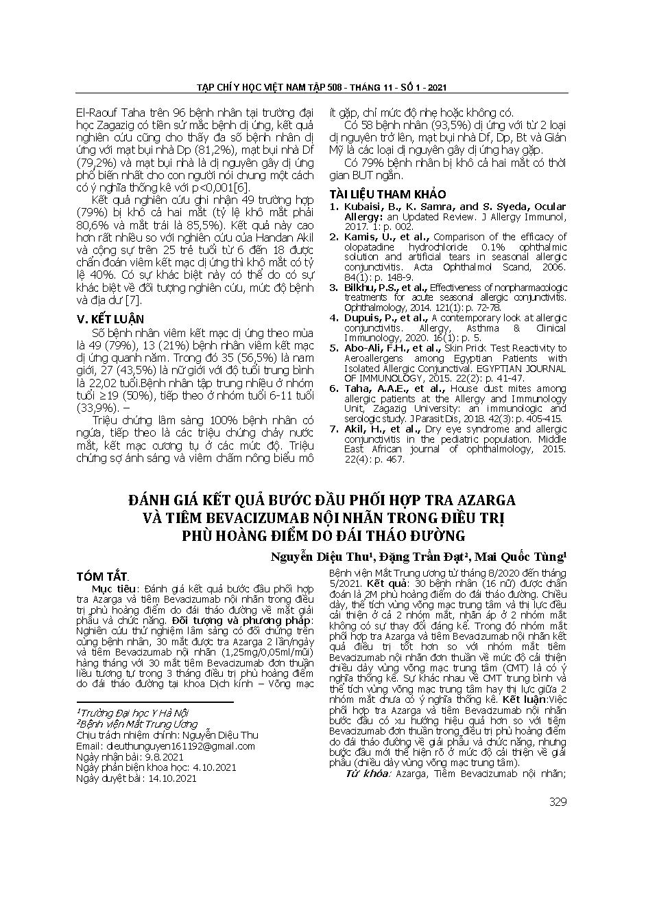 Đánh giá kết quả bước đầu phối hợp tra Azarga và tiêm Bevacizumab nội nhãn trong điều trị phù hoàng điểm do đái tháo đường = The first result of adjuvant topical Azarga with intravitreal Bevacizumab injection in diabetic macular edema