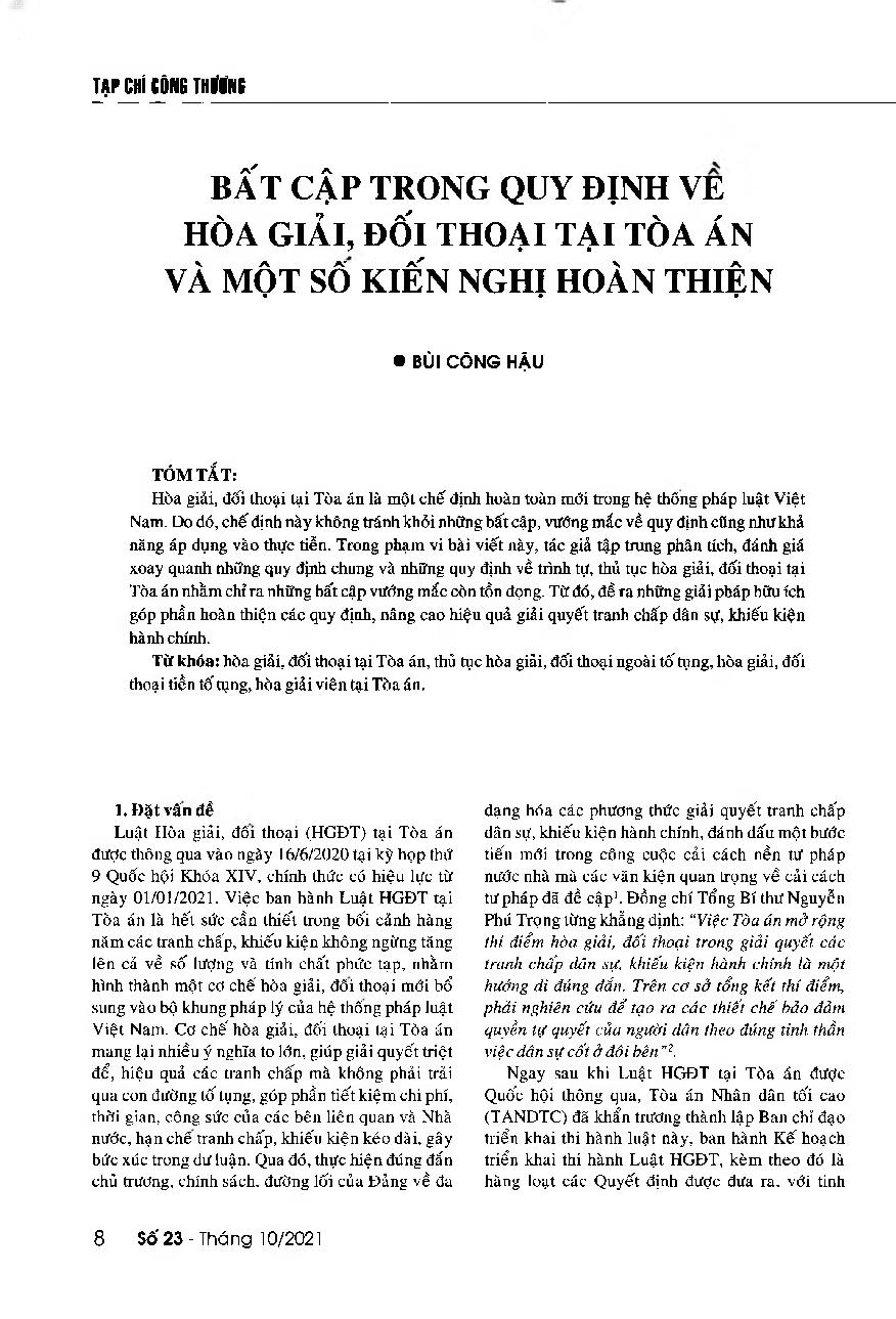 Bất cập trong quy định về hòa giải, đối thoại tại tòa án và một số kiến nghị hoàn thiện = Some shortcomings in provisions on conciliation and discussion procedures at the People's Court and solutions