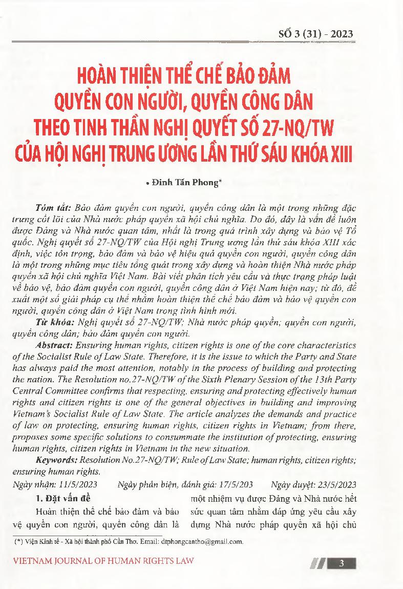 Hoàn thiện thể chế bảo đảm quyển con người, quyển công dân theo tinh thẩn Nghị quyết số 27-NQ/TW của Hội nghị Trung ương lân thứ sáu khóa XIII = Improving the institution to ensure human rights and citizens' rights in the spirit of the Resolution No. 27-N