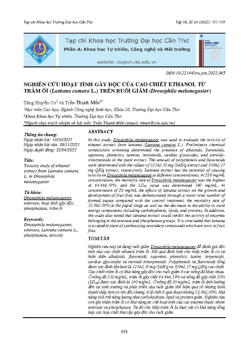 Nghiên cứu hoạt tính gây độc của cao chiết ethanol từ trâm ổi (Lantana camara L.) trên ruồi giấm (Drosophila melanogaster) = Toxicity study of ethanol extract from Lantana camara L. in Drosophila melanogaster