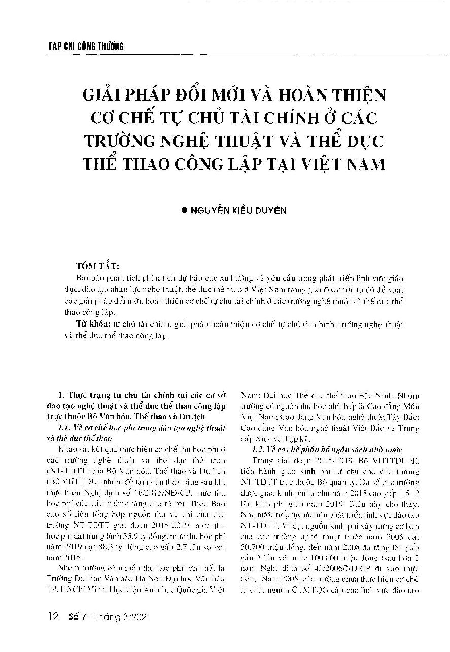 Giải pháp đổi mới và hoàn thiện cơ chế tự chủ tài chính ở các trường nghệ thuật và thể dục thể thao công lập tại Việt Nam