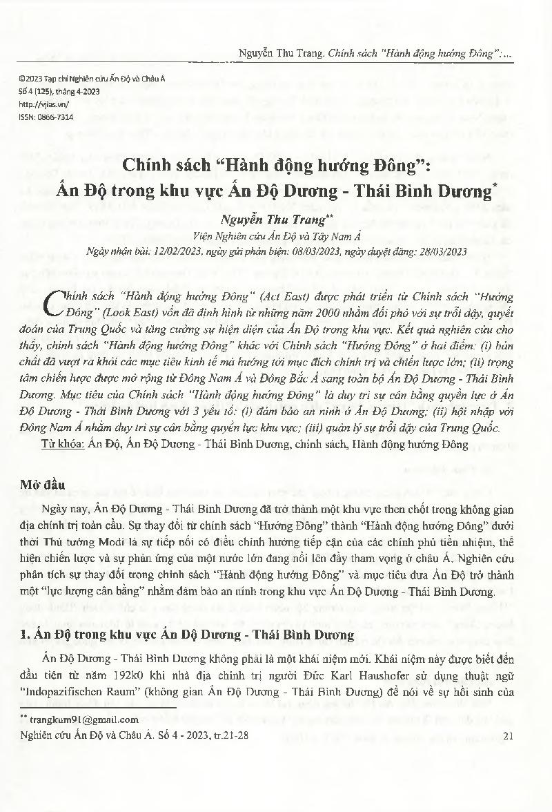 Chính sách "Hành động hướng Đông": Ấn Độ trong khu vực Ấn Độ Dương - Thái Bình Dương