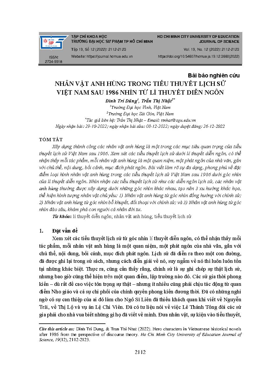 Nhân vật anh hùng trong tiểu thuyết lịch sử Việt Nam sau 1986 nhìn từ lí thuyết diễn ngôn = Hero characters in Vietnamese historical novels after 1986 from the perspective of discourse theory