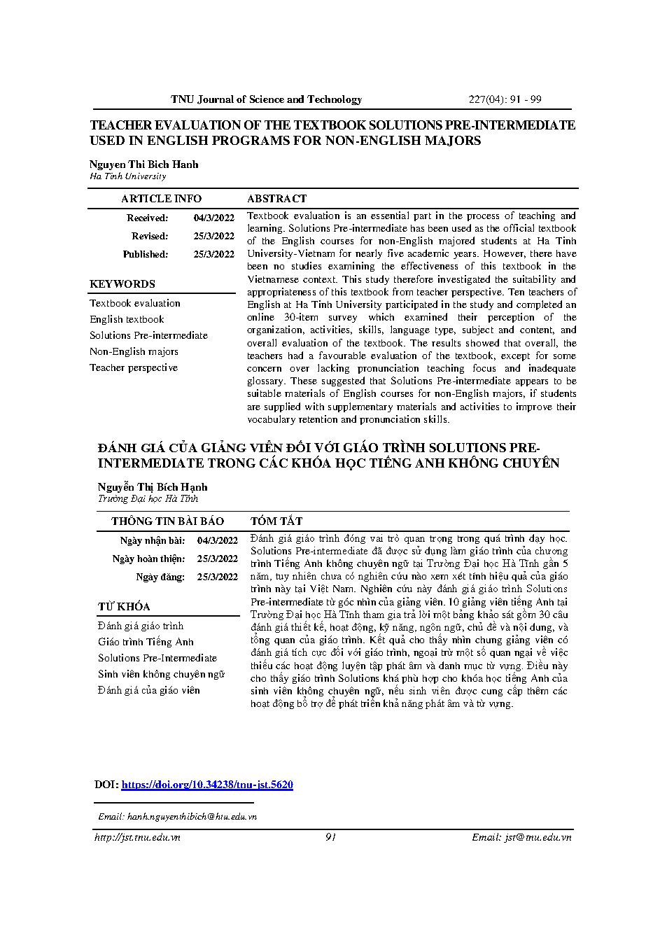 Đánh giá của giảng viên đối với giáo trình Solutions Pre-intermediate trong các khóa học tiếng Anh không chuyên = Teacher evaluation of the textbook Solutions Pre-intermediate used in English programs for non-English majors
