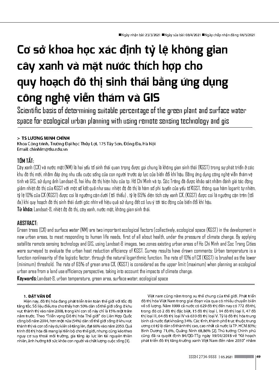 Cơ sở khoa học xác định tỷ lệ không gian cây xanh và mặt nước thích hợp cho quy hoạch đô thị sinh thái bằng ứng dụng công nghệ viễn thám và GIS