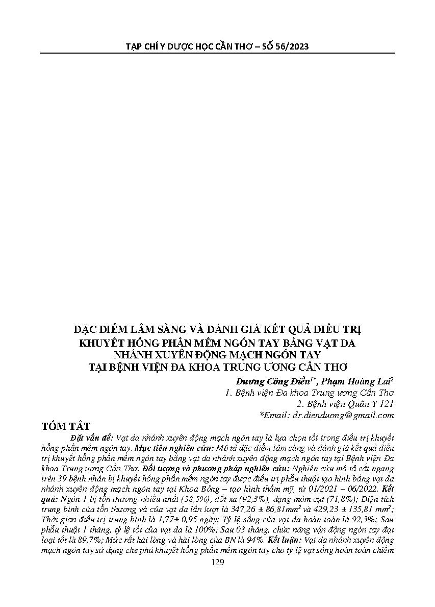 Đặc điểm lâm sàng và đánh giá kết quả điều trị khuyết hổng phần mềm ngón tay bằng vạt da nhánh xuyên động mạch ngón tay tại Bệnh viện Đa khoa Trung ương Cần Thơ