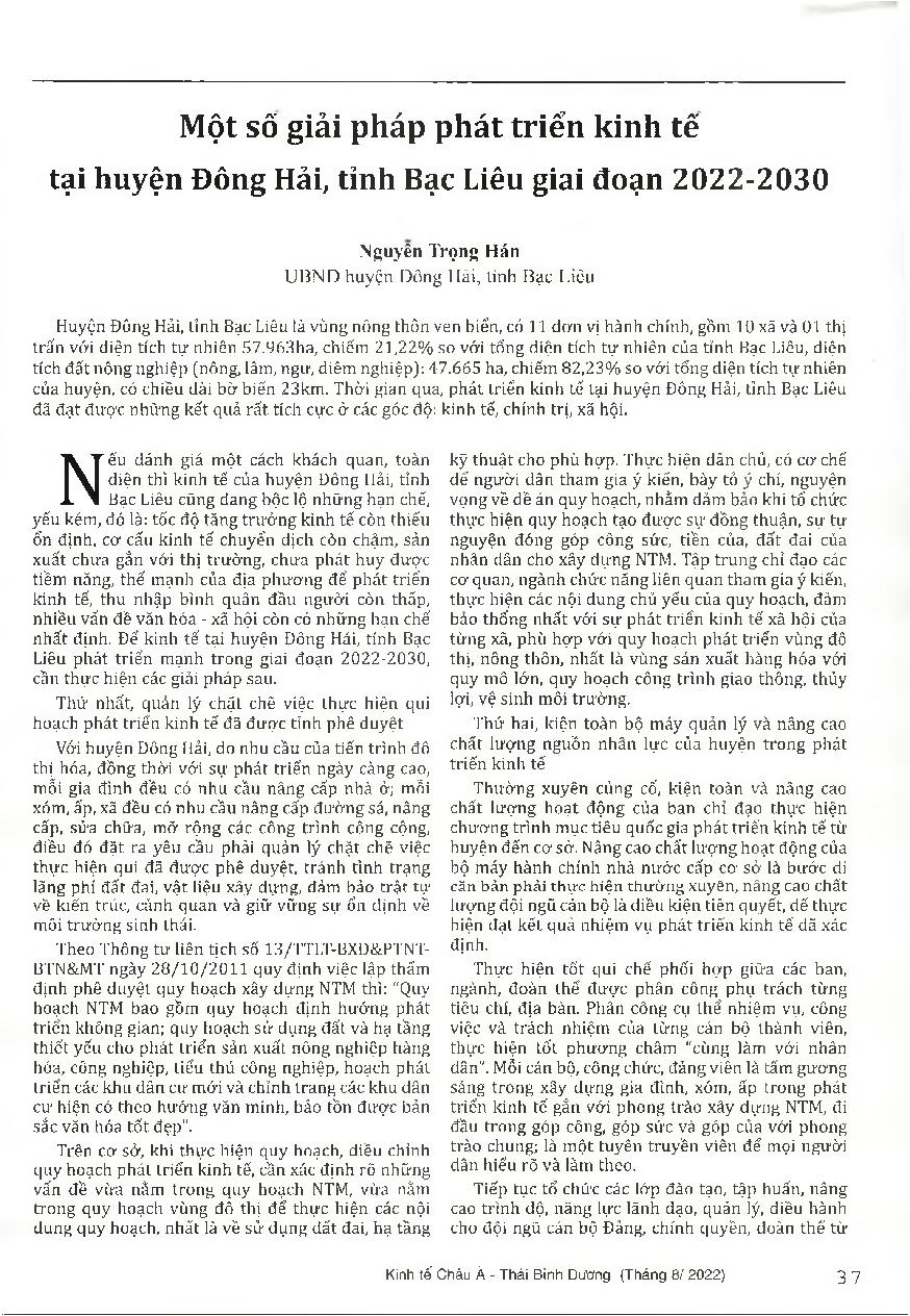 Một số giải pháp phát triển kinh tế tại huyện Đông Hải, tỉnh Bạc Liêu giai đoạn 2022-2030