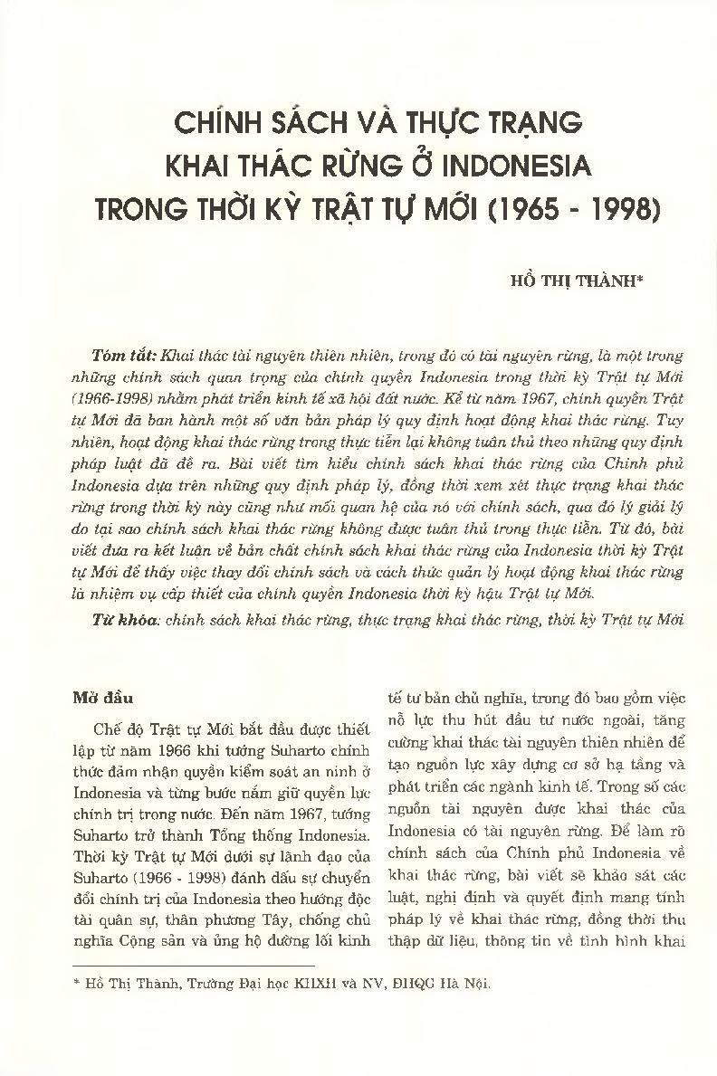 Chính sách và thực trạng khai thác rừng ở Indonesia trong thời kỳ Trật tự mới (1965 - 1998) = Policy and Situation of Forest Exploitation in Indonesia in the New Order Regime (1965 - 1998)